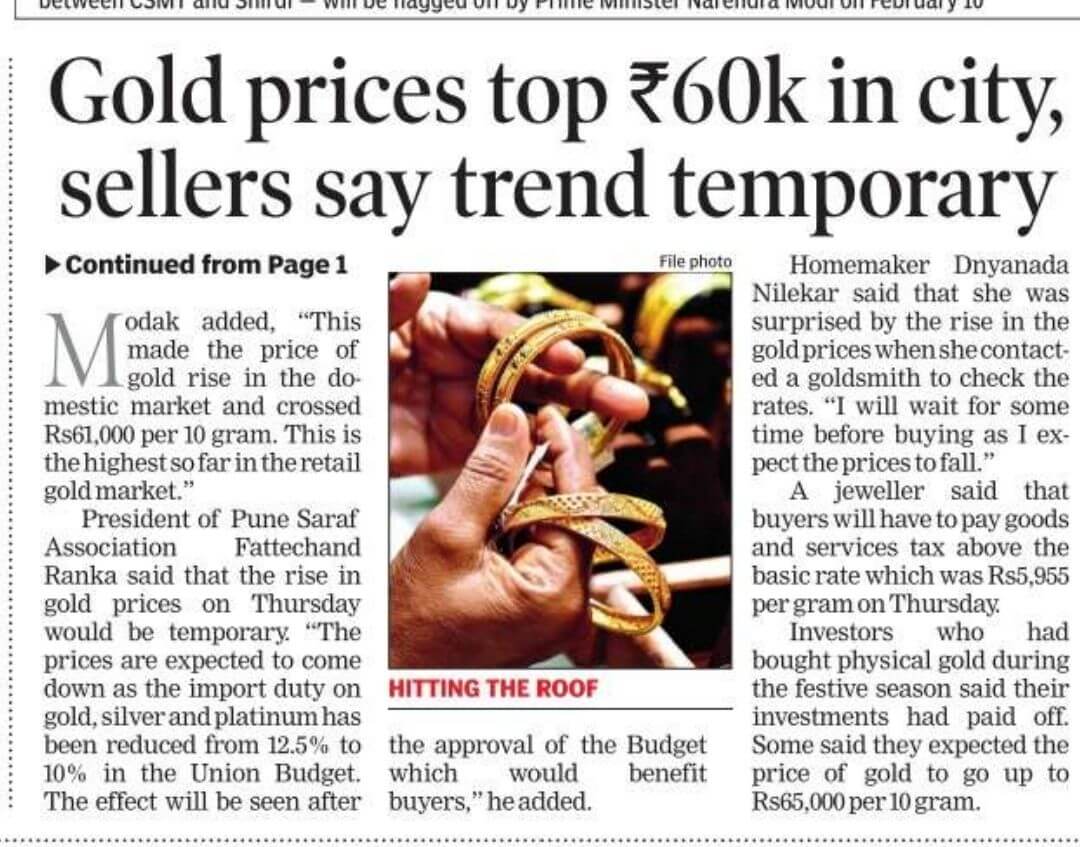 Taking a cues from the global markets, domestic factors pushed rally in Gold on the next day of union budget. Yellow metal crossed 60k mark in Indian jewellery market for the first time on February 2nd. We PNG Sons (P N Gadgil And Sons Ltd) shared a analysis about the rally. It was featured in mainline and regional media.